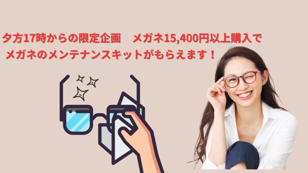 ラザウォーク店特典:17時以降メガネ購入でメガネのメンテナンスキット進呈します。